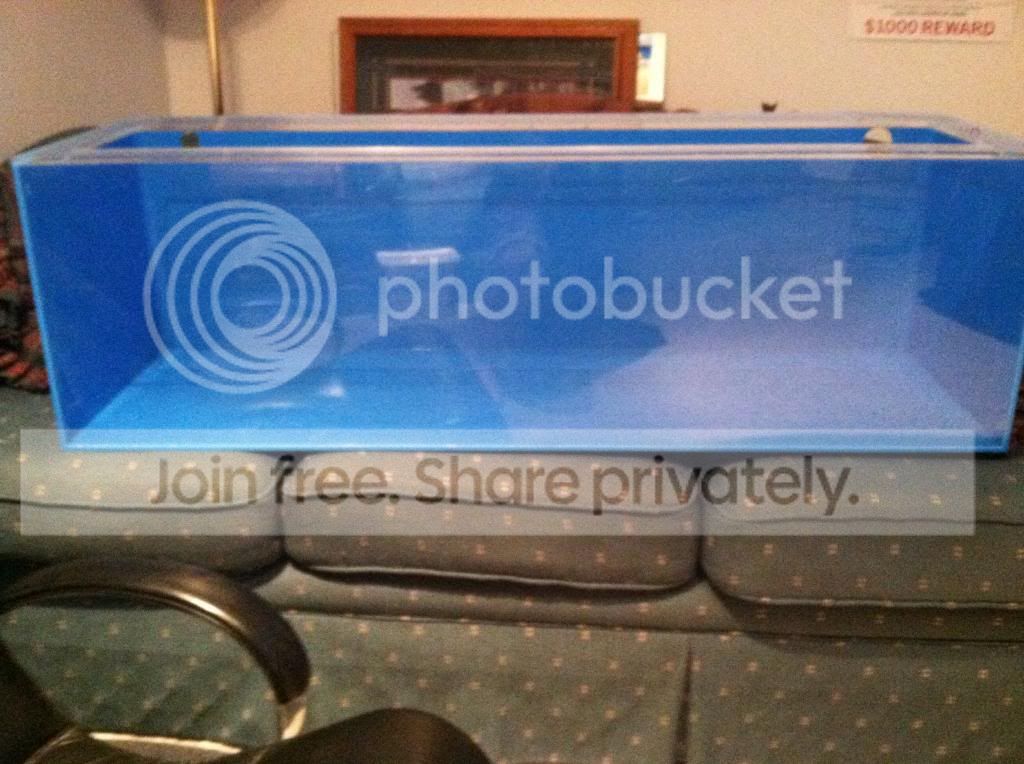 Update! Got a 40g tank from Taklu for only $20(Thank you!) and is 48x15x15 acrylic tank with blue backround and sides along with 2 3/4" holes in top left and right. Once we get our outdoor hoses working I'll begin the clean-up process.