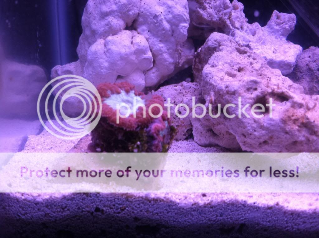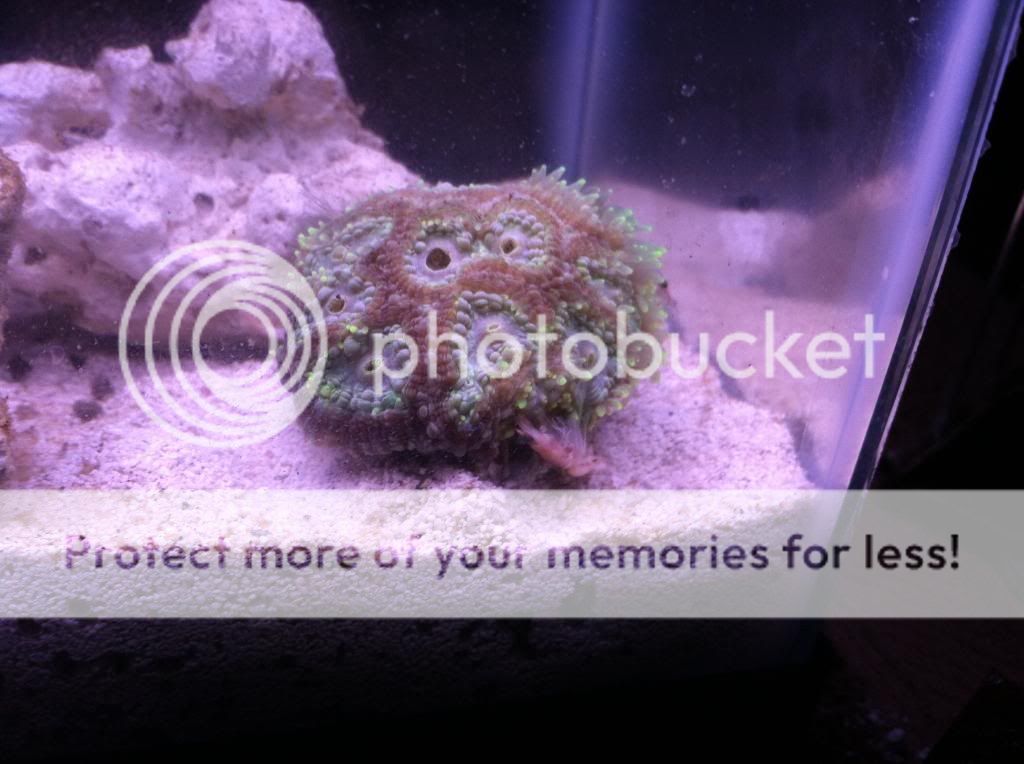 This Blasto came in pretty bad shape. 1 head looks practically dead and I can see some aptasia under the other one. Along with some algae something what looks like a practically dead head. We will see if it recovers, it did eat a small piece of mysis which is a good sign.
